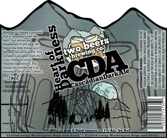 Also joining the Two Beer Brewing tap list in September is the highly anticipated Heart of Darkness Imperial Cascadian Dark Ale (CDA). First brewed this spring as a limited release with help from the crew at LOT No. 3 – a Bellevue-based restaurant owned by the Heavy Restaurant Group – the Heart of Darkness Imperial CDA will be available on tap only at the Two Beers Brewing tasting room and in 22-ounce bottles at select retailers. An imperial version of the emerging “Black IPA” style, the Heart of Darkness Imperial CDA mixes dark roasted specialty malts with highly citrus and floral hops, and is then dry-hopped with Columbus hops for a smooth finish. Flavors of molasses, dark cherry, oak and chocolate will grace the palate of all those that enjoy this unique, handcrafted brew.