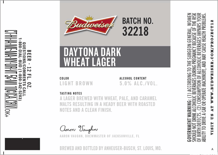 Budweiser Batch No. 32218 Daytona Dark Wheat Lager