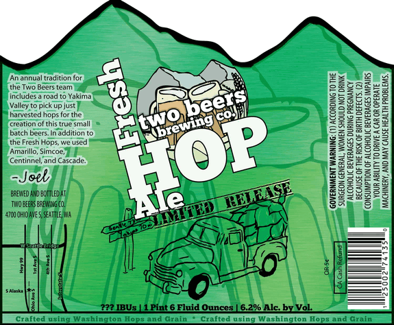 (Seattle, WA) – Claiming its spot as the first fresh hop style brew released in Seattle, Two Beers Brewing is proud to announce the arrival of its Fresh Hop 2011. Hop-enthusiasts can enjoy their first taste of this long-awaited beer beginning September 2 at the Two Beers Brewing tasting room, with Fresh Hop hitting shelves in 22-ounce bottles and appearing on tap across the Pacific Northwest beginning September 5. Accompanying Fresh Hop 2011 as Two Beers Brewing’s seasonal offerings are its Heart of Darkness Imperial CDA and Pumpkin Spice Ale.